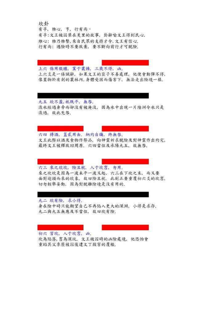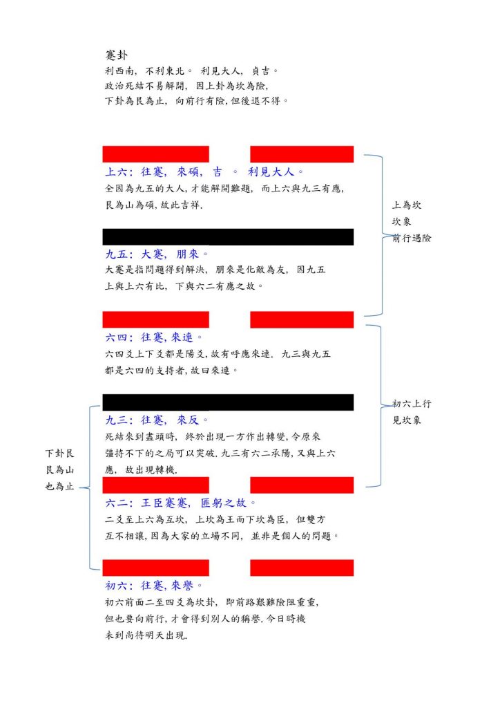 • 卦辭解讀:「元亨利貞。勿用,有攸往。利建侯。」表示雖處困境,但有利於建立邦國。