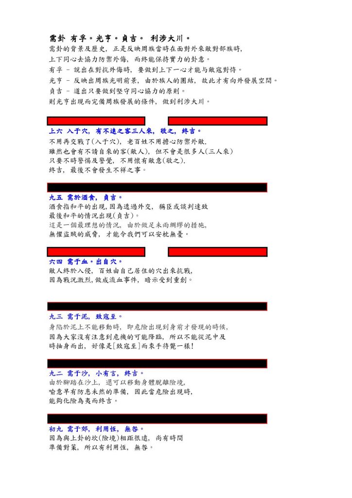 – 書中引用《戰國策》中燭之武退秦師的故事,將需卦初九「需於郊,利用恆」比喻為鄭國作為軍事前線,提供後勤支援,避免秦國被晉國牽制。