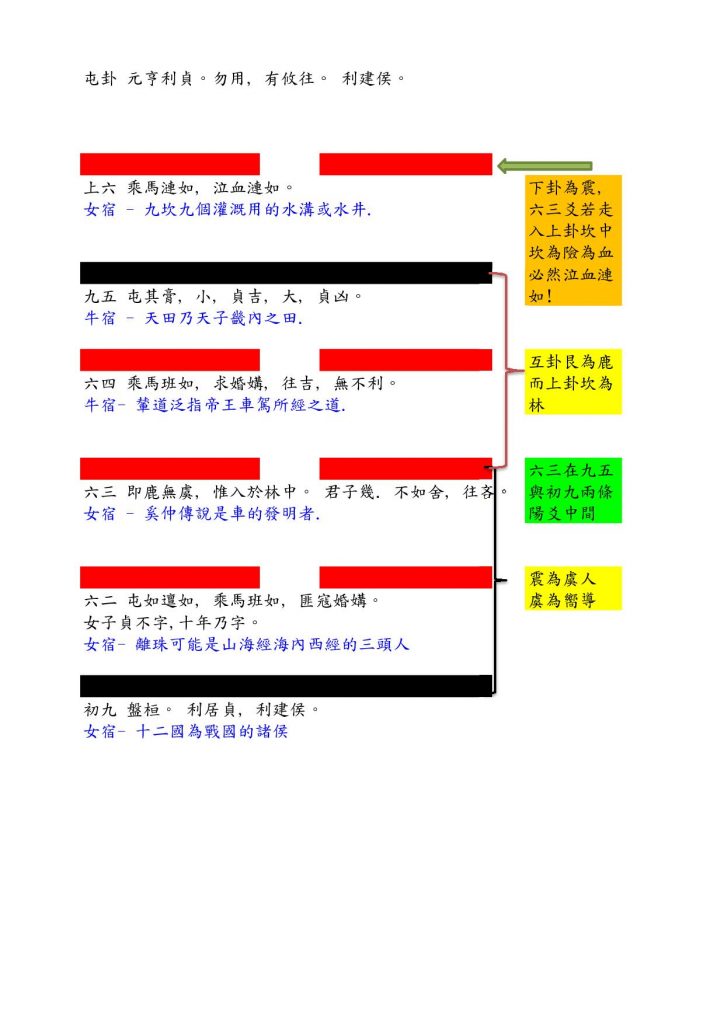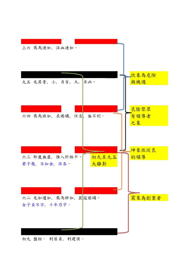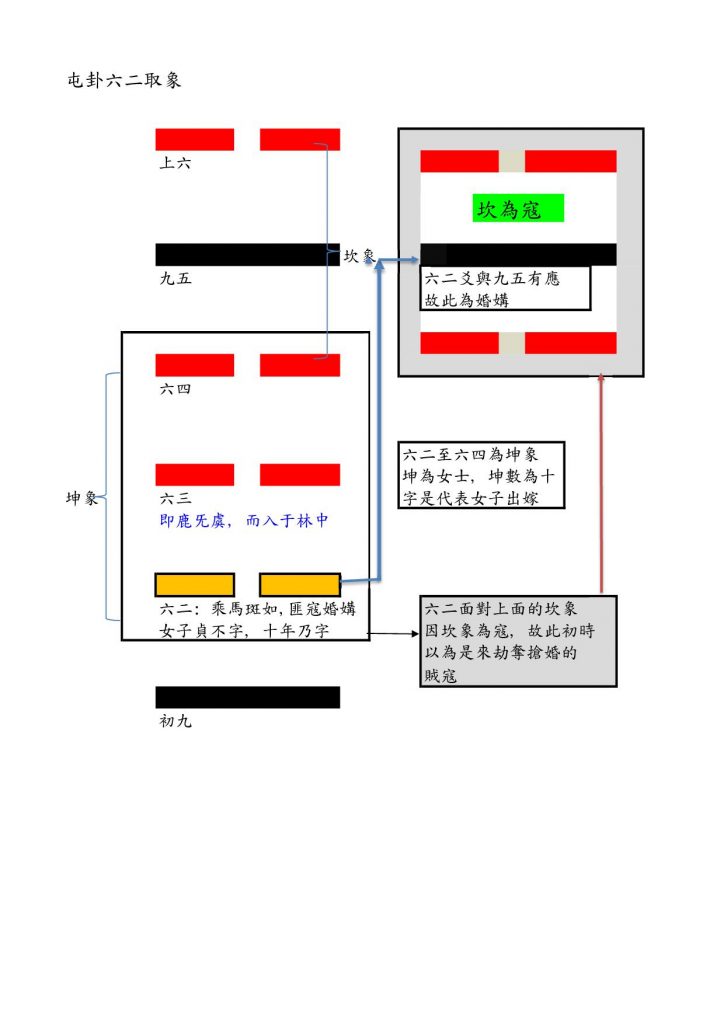 當我們知道屯卦的卦意, 是古時太卜以周族初創時期為背景 , 只要跟隨著這個方向, 以六二與九五爻為重心, 便可找到太卜的取象方式 – 坎象與坤象 (演算法).