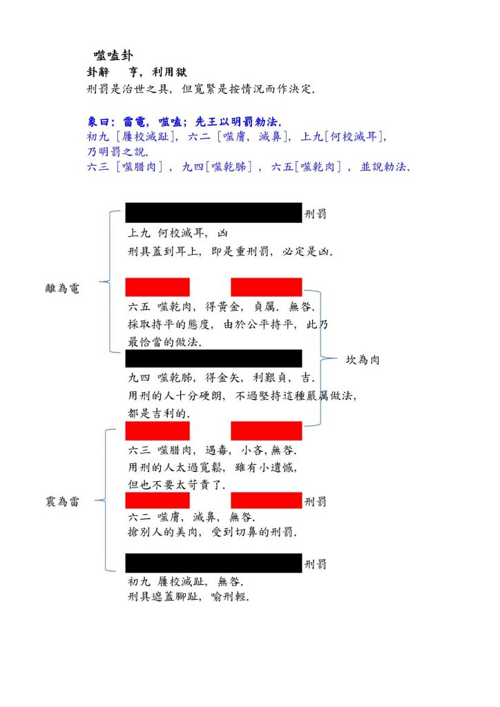 如噬嗑卦卦 以初九 [屨校滅趾], 六二[噬膚, 滅鼻]及上九[何校滅耳]作明罰; 而卻以六三[噬腊肉], 九四[噬乾胏]及九五[噬乾肉]作勑法去貫通整個卦意。