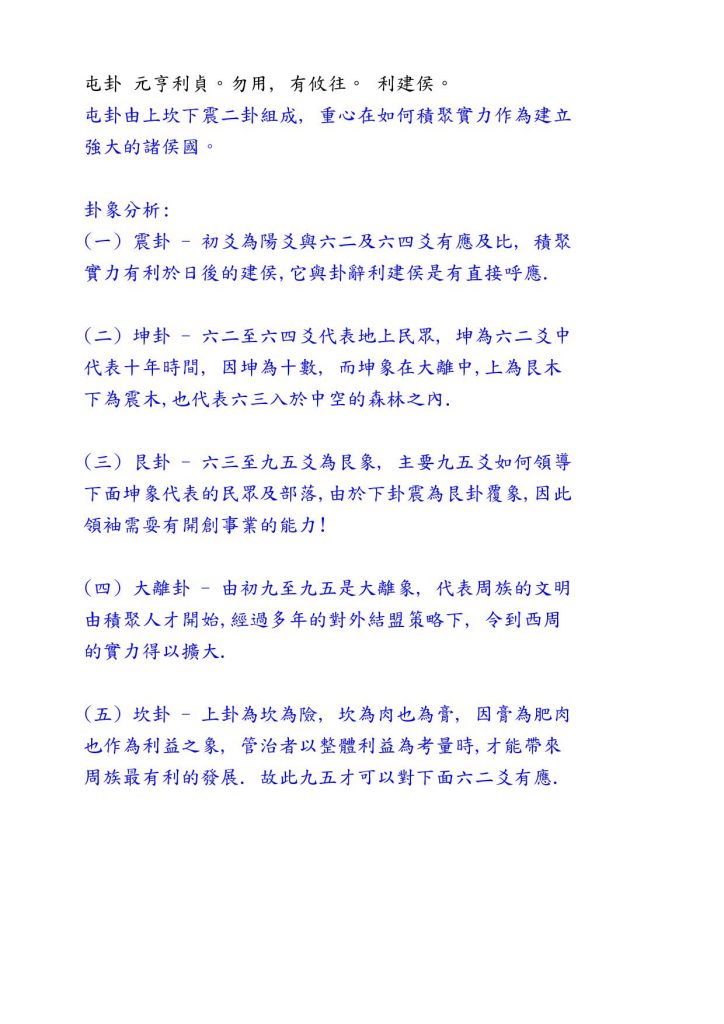 屯卦卦象以西周由西南方小部族,悉心經營及面對困難下成為諸侯王的歷史缩影。卦意与爻辭好像描述創業者,在企業發展上如何建立客户網及削弱對手。