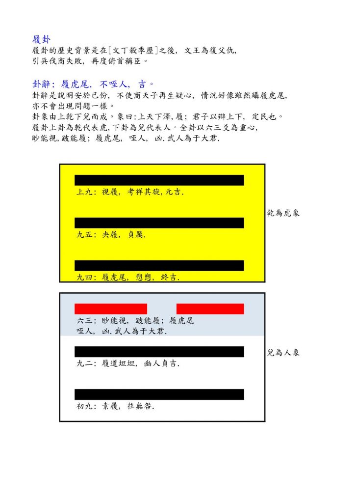 卦辭: [履虎尾, 不咥人, 亨。] 是說明安於己份, 不使商天子再生疑心, 情況好像雖然躡履虎尾, 亦不會出現問題一樣。長遠而言對周翦商大業有利, 故此曰吉。