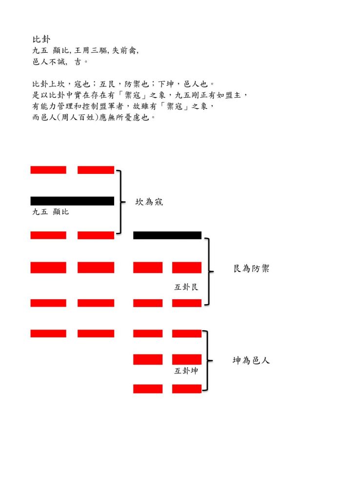 比卦上坎,寇也;互艮,防禦也;下坤,邑人也。是以比卦中實在存在有「禦寇」之象,但此九五剛中正,如盟軍之主,有能力管理和控制盟軍者,故雖有「禦寇」之象,而邑人(周人百姓)應無所憂慮也。