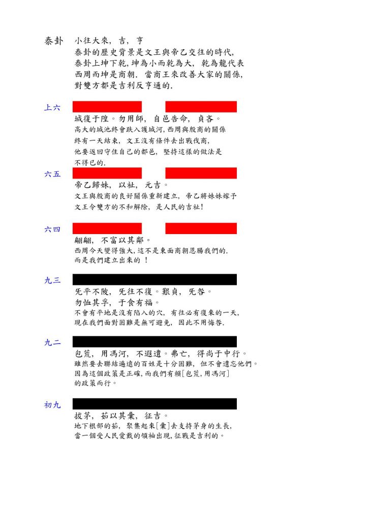 經十八次推算出了六條爻,下卦為乾而上卦為坤的泰卦,而卜卦在九三爻出現爻变,爻辭:《无平不陂,无往不復。艱貞,无咎。勿恤其孚,于食有福。》