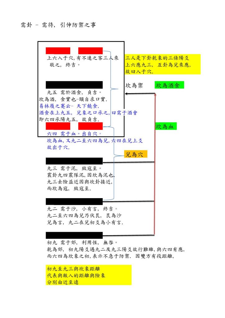 需卦乃需待,引伸為防禦之事。需卦由上坎下乾组成,坎為防禦也為寇。