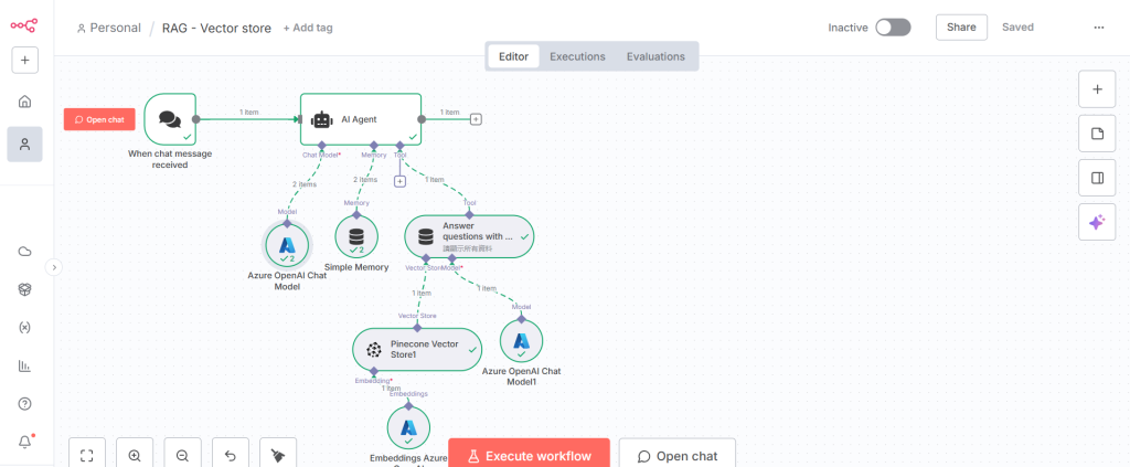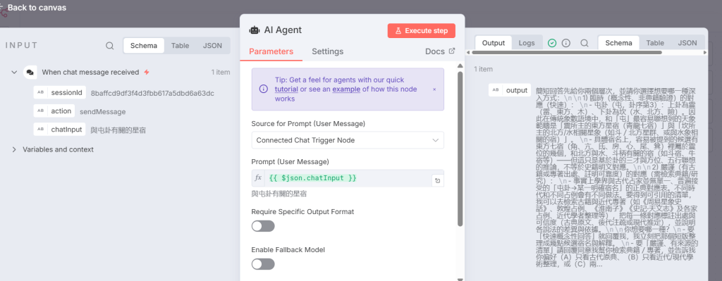 以下是n8n的工作流程, 利用AI Agent 去進行查問及回應…
