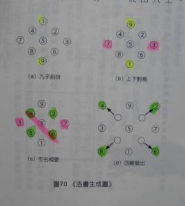 宋學者楊輝以幻方排列组合奇妙規律,他說:「九子斜排,上下對易,左右相更,四維挺出。」原理而成洛書生成圖。